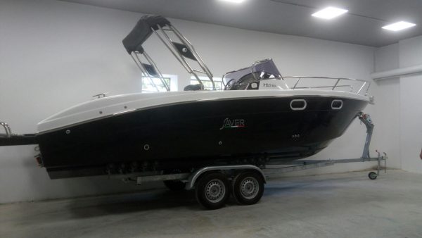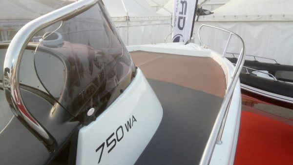 New styles for this WalkAround boat which proposes more embracing and soft lines, both as regards the steering console, characterized by the presence on both sides of steps leading to the hard bow sun, which in the bulwarks, and on deck. The latter is characterized by its daytime habitability, with a large sofa to ‘L’ stern that can be turned into a second generous sunbathing. For a complete autonomy externally always be provided on board a mobile behind the pilot’s seat incorporating a sink and can accommodate a gas and a built-in refrigerator. The console, as said, has enveloping forms, as is the highly protective windshield. Going down in the cabin you have available a modular dinette with double bed, but also an enclosed toilet in separate room, as well as a mobile placed at the entrance. Large portholes make the bright day environment, blacked out at night with special curtains. Aft of the stern platforms stand out to the sides of the engines, which can be a total of two outboard for 175 hp each. Both the cockpit and the stern platforms benefit from the teak cover for better appearance and greater comfort.